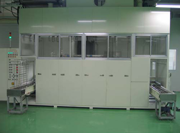 由操作者将装有工件的清洗篮放在进料台上,然后自动送至清洗机进料位,经机械手将清洗篮依次推入清洗机内进行清洗、真空干燥,田后经出料台自动将清洗篮送出,(取出工件),完成整个清洗到烘干的过程。